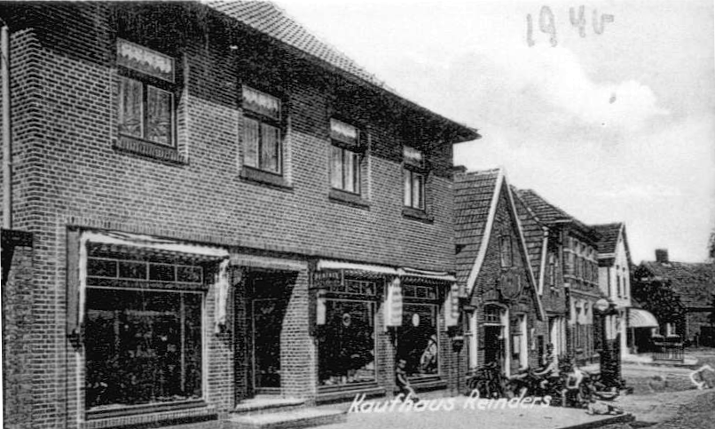 Das Geschäftshaus Reinders im Jahr 1940 (2023 Geschäft Mine). Nach rechts die Werkstatt Reinders und die Häuser Wolf-Büter / Kip / Textilgeschäft Diek und